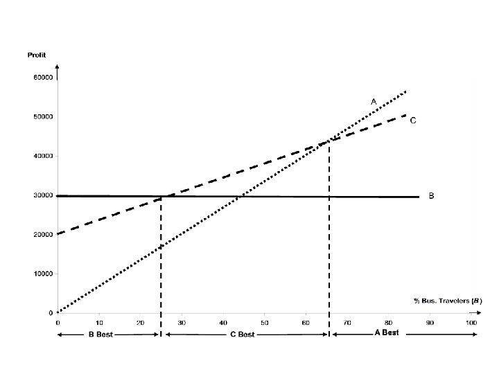 Comparison of 3 Options (A) sell only unrestricted tickets at a price of ______ to business travelers only; Profit: (B) sell only unrestricted tickets at a price of ______ to all travelers; Profit: (C) sell unrestricted tickets to business travelers for ______ and restricted tickets to leisure travelers for _____. Profit: