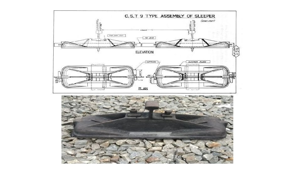 C. S. T. – 9 or Central Standard - 9 sleeper These sleeper was standardized by Track Standard Committee. It has been extensively used on Indian Railway for last 30 years. It has a triangular inverted pot on either side of the rail seat , a plate with the projecting rib and a box on the top of the plate. These sleeper for B. G. weighs 103 kg. This sleeper can be easily assembled or dismantled without mechanical equipment.