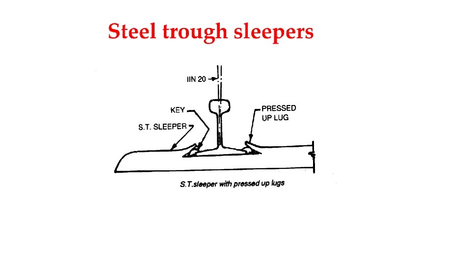 Steel sleepers : - • These sleeper should maintain perfect gauge. • It should be possible to fix rails easily in sleeper and without moving the sleeper longitudinally. • The rail should have sufficient bearing area on the sleeper. • The metal of sleeper should be strong enough as beam. • They should be sufficiently heavy for stability. • It can’t be used in the track circuited area.