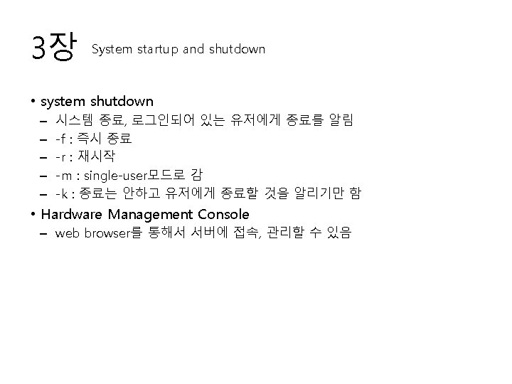 3장 System startup and shutdown • startup modes – normal mode – system management services(sms) <- 부팅시 f 1 or 1 • firm ware에서 동작, 부팅순서를 설정 – maintenance mode <- 부팅시 f 5 or 5 • 부팅이 안될 때 수리할 때 사용, root암호 잃어 버렸을 때 사용 – Diagnostics(진단) • startup process – power on -> post -> locate os bootstrap image -> find aix boot image -> load aix boot image -> configuration manager phase 1 -> init 위 부분이 잘 이해가 안 감 특히 책의 bootstrap code 부분이