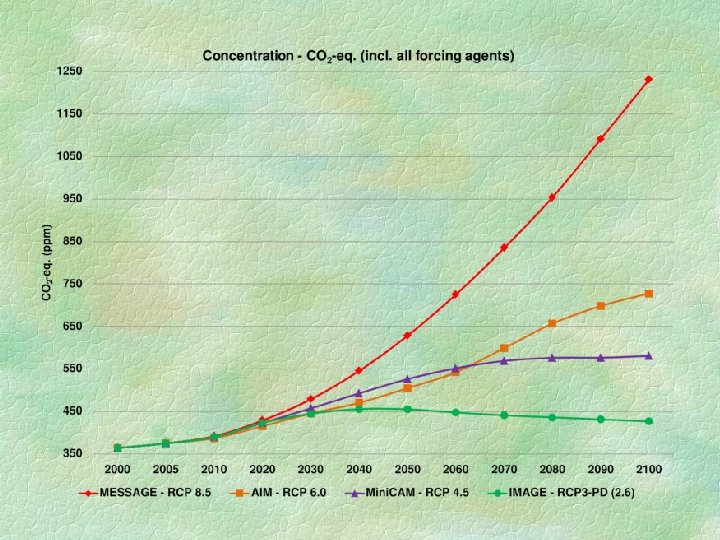 RCP (Representative Concentration Pathway) - představují čtyři trajektorie (cesty) dosažení určitých koncentrací skleníkových plynů (nejde o emisní scénáře) na konci 21. století v porovnání s předindustriálním obdobím, které byly připraveny pro potřeby modelování a výzkumu pro pátou hodnotící zprávu IPCC: a) RCP 2. 6 – 2, 6 W. m-2 – výrazné snížení koncentrace CO 2 v atmosféře (421 ppm k roku 2100) b) RCP 4. 5 – 4, 5 W. m-2 – stabilizace koncentrace CO 2 na nižší úrovni (538 ppm) c) RCP 6. 0 – 6, 0 W. m-2 – stabilizace koncentrace CO 2 na vyšší úrovni (670 ppm) d) RCP 8. 5 – 8, 5 W. m-2 – bez omezení emisí (936 ppm)