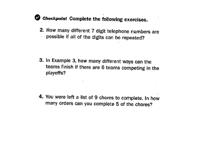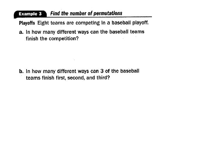 • Permutations: An __________________________________ Example: 6 permutations of the letters A, B, and C _____, ______, ______ • Factorial: ________________________________________ Symbol: ____