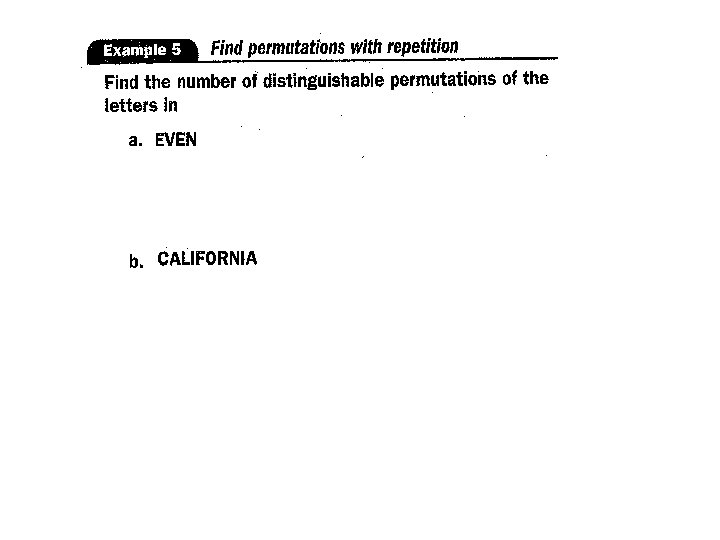 • Permutation with Repetition • The number of distinguishable permutations of n objects where one object is repeated s 1 times, another is repeated s 2 times, and so on, is given by the formula: • ___________________