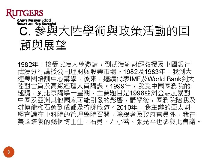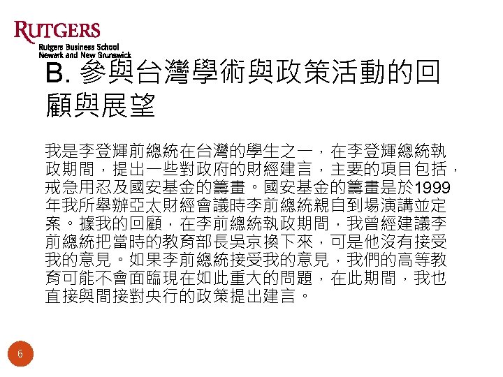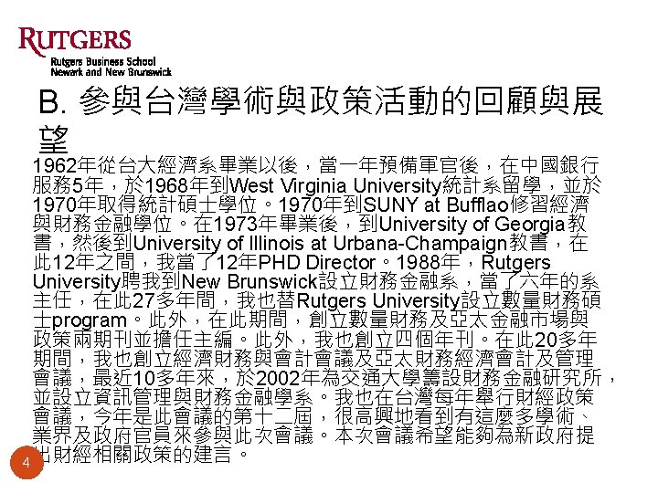 30多年來參與兩岸財經政策與學術 活動之回顧與展望 Cheng Few Lee Distinguished Professor of Finance, Rutgers University , USA Editor of RQFA, RPBFMP, AFPF, AIAPM and AQAFA lee@business. rutgers. edu 2016. 5. 28 2016金融與經濟政策研討會 1