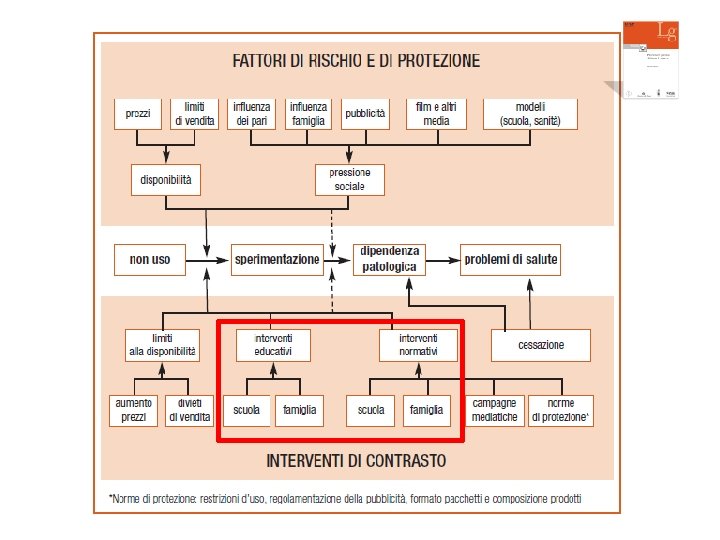 Interventi familiari • L’esempio dei genitori gioca un ruolo fondamentale nell’iniziazione dei figli. Più il figlio è abituato sin dalla tenera età ad avere accanto fumatori, maggiore è il rischio di divenire a sua volta fumatore. – Il tabagismo dei genitori triplica la probabilità dei figli maschi di divenire fumatori (OR=3, 06; IC 95%: 2, 28 -4, 11) e quadrupla quella delle figlie femmine (OR=4, 20; IC 95%: 2, 66 -6, 63) (Baška 2010). Risultati simili in altri studi (Wilkinson 2008; Chassin 2002; Leatherdale 2006) – Il figlio/fratello di fumatori tende a sovrastimare la presenza di fumatori e a ritenere il fumo un comportamento socialmente accettato. Si instaura un circolo vizioso nel quale le errate percezioni aumentano la probabilità di iniziazione dei figli, i quali a loro volta aumentano la percezione distorta di diffusione tra i coetanei (Reid 2008).