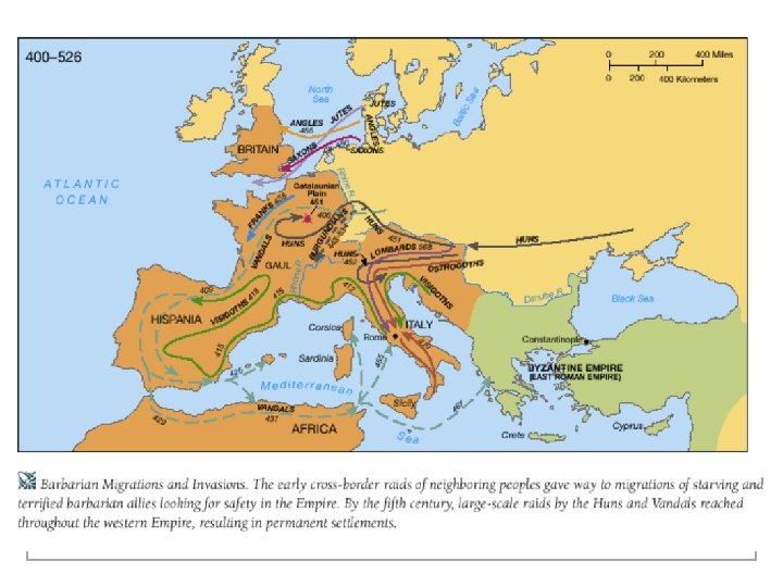 300 -1400 CE: MIDDLE AGES n Rise and fall of empire's n n Roman Empire - Eastern Roman Empire, which became the Byzantine Empire, survived. The Western Roman Empire: population decline, especially in urban areas, decrease of trade, and increase in immigration. n DARK AGES – Shows the cultural and economic deterioration that supposedly occurred in Europe following the decline of the Roman Empire (Western). A time when the forces of darkness, the barbarians, overwhelmed the forces of light, the Romans. n Crusades n Wars - Germanic tribes took over Western Roman Empire n And most destructive…bubonic plague (Black Death)