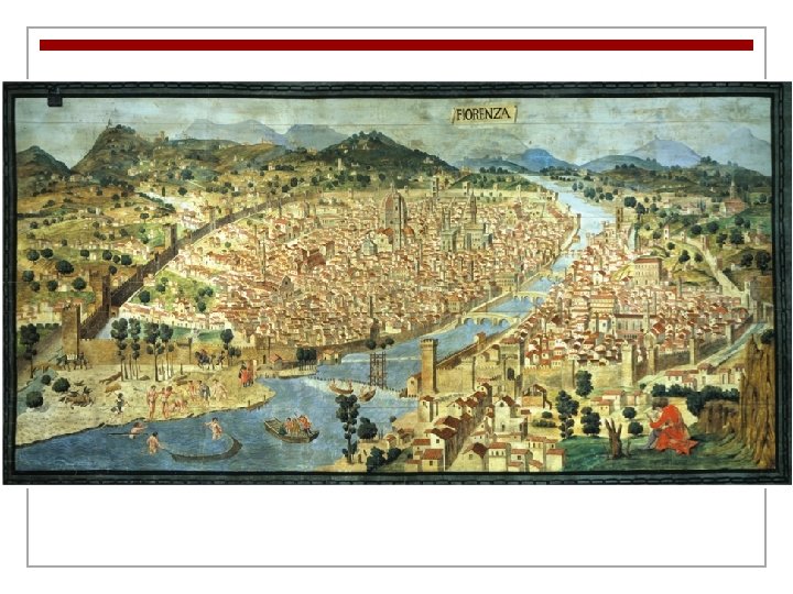 City of Florence n 1. What factors helped Florence to become a wealthy city? n n 2. How did Florence’s wealth contribute to its cultural activity? n n Because of its ideal location on the Arno River, Florence became a center for trade and commerce. It also was dominated by the Medici family, who helped Florence become a banking center for Europe. The city’s residents could afford to be patrons of artists and thinkers. [wealthy merchant class] 3. Why did many travelers come to Florence? n Some travelers came to do business, while others came to study art. Still others came to learn at the city’s schools and libraries.