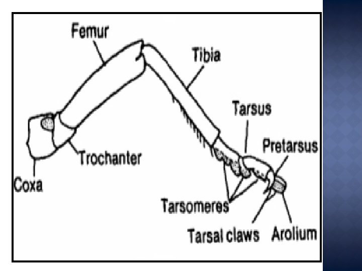 � Coxa: usually a short, stout article. It is the functional but not primitive basal attachment of the legs to the thoracic body wall. � Trochanter: is a short articls between the coxa and the femur. It is usually reduced and is almost always singles. � Femur: is the section of leg between the trochanter and the tibia. Its generally the legs most prominent, robust article. It may be armed with stout but immovable spines.