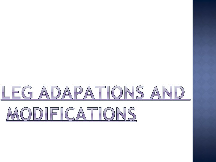 Running legs (Cursorial legs) are modified for running. Note the long, thin leg segments. � Examples: Cockroaches (order Blattaria), � 2.