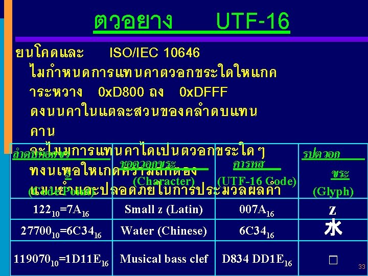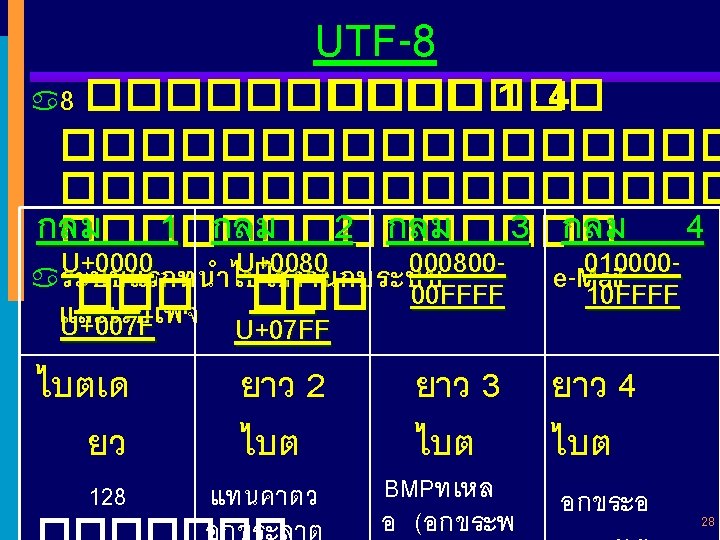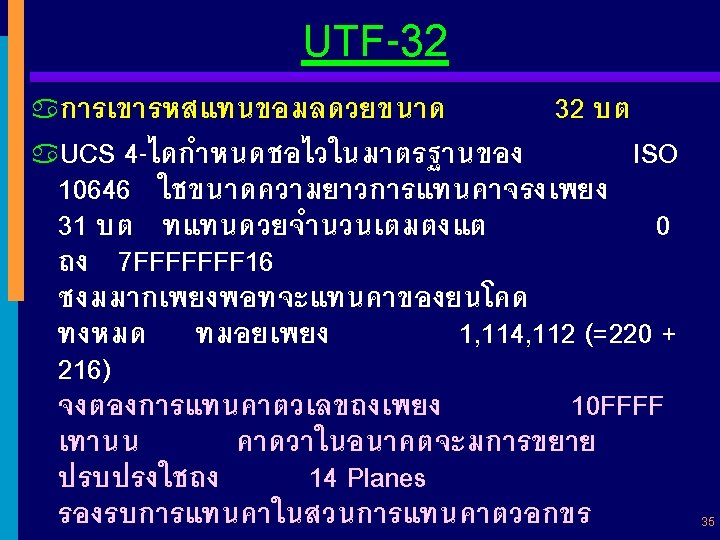 UCS : Universal Character Set a. UCS-2 – 16 bits เขารหสความยาวคงทสำหรบรอง รบ BMP : Basic Multilingual Plane a. UCS-4 – 32 bits เขารหส 22