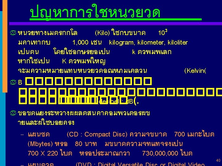 คำนำหนาหนวยวด มาตรฐาน SI-Prefix (International System of Units) (Système International d’Unités) ขนาดของหนวยว ด 103 หรอ ~210 106 หรอ ~220 109 หรอ ~230 1012 หรอ ~240 1015 หรอ คำนำหนา ทใช อกษร ยอ ตวอยาง Kilo K Kilobit (kb, Kb. ), Kilobyte (k. B, KB. ) Mega M Megabit (Mb. ), Megabyte (MB. ) Giga G Gigabit (Gb. ), Gigabyte (GB. ) Tera T Terabit (Tb. ), Terabyte (TB. ) Peta P