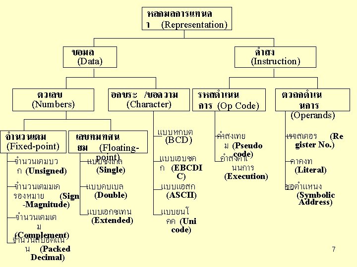 ����� Character Representation BCD, ASCII, EBCDIC, Uni. Code a Numeric Representation Fixed-Point Numbers (Integer) Floating-Point Numbers (Real) a 8