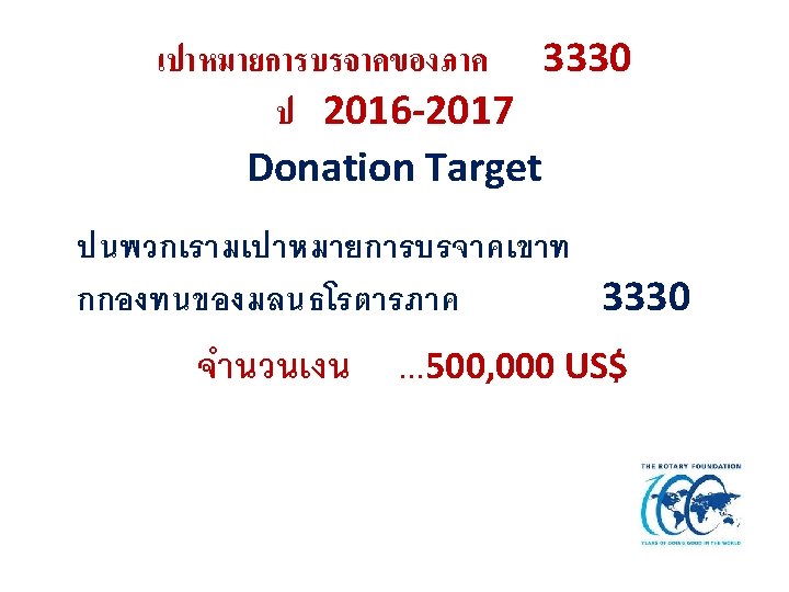 Rotary Foundation District 3330 2015 -2016 Contribution Goals เปาหมายการบรจาค )RRFC goal ( US$ ยอดเงนการบรจาค ณ 31 ก. ค. 2559 US$ Total contribution (31 July 2016) รอยละของความสำเรจ ( Achievement ) สโมสรทไมมการบรจาค สโมสร (Non contributing clubs) 500, 000 452, 421 90 % 15