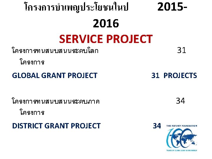 AVAILABLE DDF BY DISTRICT YEAR 2015 -2016 50% of Annual Fund Share contributions from 2012 -2013 เงนปนสวนทภาคไดรบกลบคนมาจากการบรจาคไวในปพ. ศ. 2555 -2556 50% of Available Endowment Fund Share Earnings เงนผลตอบแทนจากกองทนถาวร 182, 464. 37 $ 1, 189. 29 $ Carry Forward from 2015 -2016 220, 258. 94 $ ยอดเงนยกมาจากปพ. ศ. 2558 -2559 Total DDF )รวม) 403, 912. 60 $ Project Funding ) การใชเงน DDFเพอทำโครงการ ( DG 1623643 90, 974 $ (โครงการทนสนบสนนระดบภาค ) GG 1527882 5, 000 $ (นครศรธรรมราช ) GG 1531012 5, 750 $ (นครปฐม) GG 1634219 1, 000 $ (ทาเรอ -กาญจนบร ) GG 1635455 3, 000 $ (ภเกตเซาท ) GG 1636310 2, 000 $ (บานโปง ) GG 1636882 5, 000 $ (สมทรปราการ ) Total DDF Funding (รวม) (GG 20% / DG 80%) 112, 724. 00 $ Rolled Forward Amount for District 3330 )ยอดเงน DDFยกไปปหนา ) 291, 188. 60 $