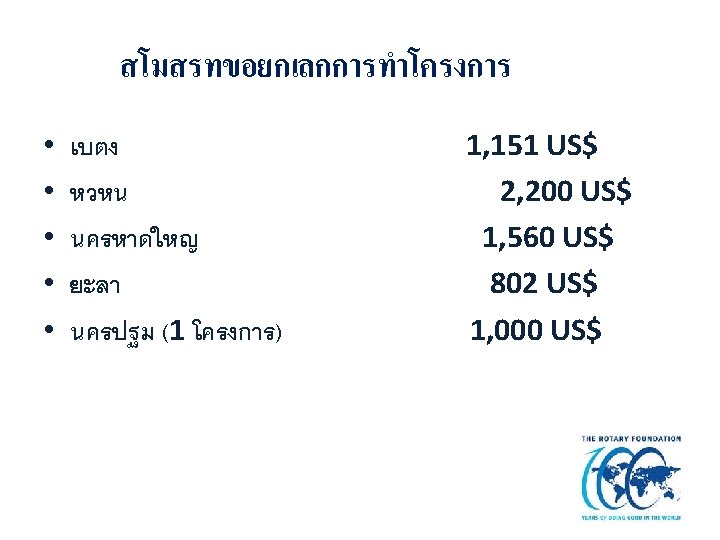 โครงการทนสนบสนนระดบภาค DISTRICT GRANT PROJECT โครงการบำเพญประโยชน (Service Projects( 71, 974 US$ สนบสนนการจดประชมของภาค 8, 000 US$ )District Grant Management Seminar ( )District Assembly for Rotaract ( งบสำรอง ( Contingency ( 11, 000 US$ รวม ( Total (90, 974 US$