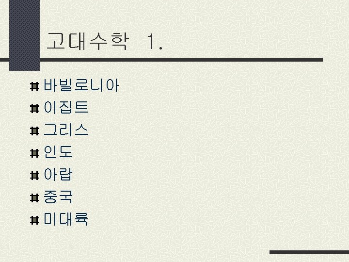 바빌로니아 수메리안 3500 BC 바빌로니아 2000 BC Cuneiform(wedge shaped) Numeral (first position system) base 60 = 1*2*3*4*5 24시간 60분 60초 테이블: 제곱, 역수(몇 천억까지), 세제 곱등 82 = 1, 4 = 1 60 + 4 = 64
