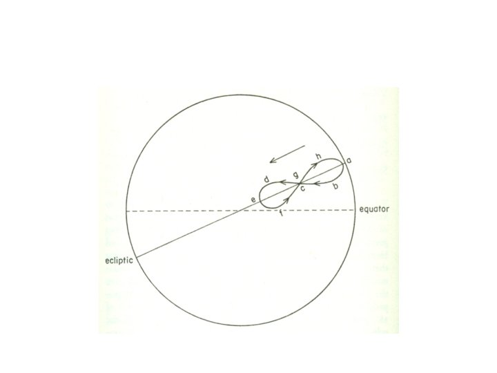 F__ equant H__ parallax I__ celestial equator K__ solstice G__ hippopede A__ precession N__ ecliptic J__ eccentric B__ retrogression E__ deferent D__ empyreum C__ equinox L__ epicycle A. event causing earlier equinoxes in each successive year B. apparent reverse motion of planet C. point of intersection of celestial equator and ecliptic D. outermost celestial sphere E. orbit carrying an epicycle F. point opposite Earth and equidistant from center G. pattern produced by embedded spheres on offset axes H. apparent shift in position of object against background I. plane projected from Earth’s middle intersecting celestial sphere J. orbital center offset from true center K. point of greatest angular difference between Sun and ecliptic L. orbit carried on larger orbital path M. apparent path of Sun and planets