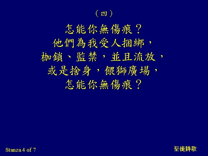 (三) 怎能你無傷痕?僕人該與主人同樣! No wound? no scar? Yet, as the Master shall the servant be, 本該與我同受創傷, 而你卻是完整無恙! And pierced the feet that folow Me: But whole? can he have followed far 怎能你無傷痕? Who has no wound nor scar? Stanza 3 of 7 聖徒詩歌