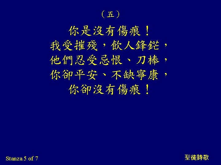 (六) 你卻沒有傷痕! 是否你向世俗依傍, How come you have no scar? ! Are you succumbing to this world, 你怕自己利益失喪, 遠遠跟隨,不甚明朗, For fear of loss, afraid of trouble, so you follow from a distance, 所以沒有傷痕? therefore you have no scar? Stanza 6 of 7 聖徒詩歌