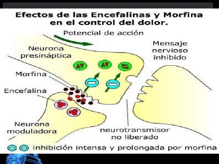 Sintesis de neurotranmisores Almacenamiento del neurotransmisor Liberación del neurotransmisor Inactivación del neurotranmisor Células Gliales Cuerpo celular o soma Termicación nerviosa(enzimas) Axón Vesículas de la terminación nerviosa Exocitosis calcio dependiente Degradación química o por reabsorción en las membranas.
