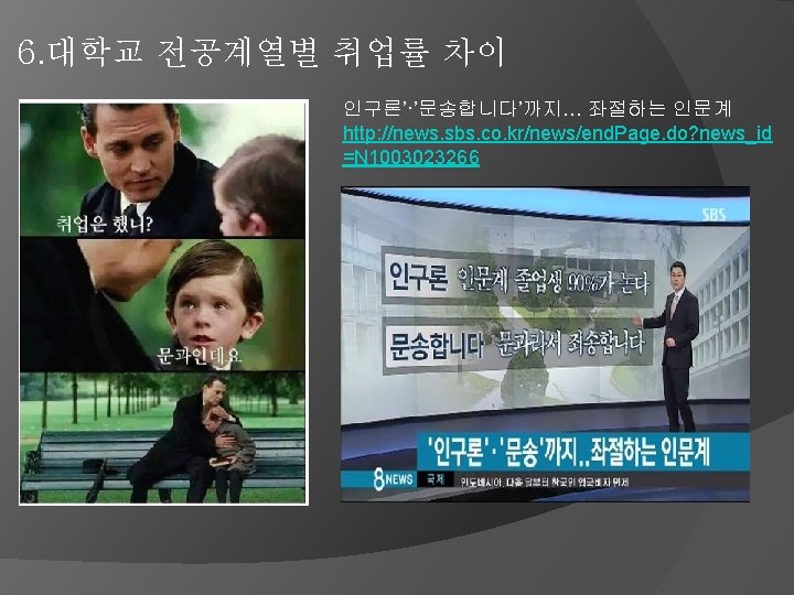 5. 대학이 취업학교가 된 이유 1. 청년 실업률 상승과 취업난 심화 http: //news. sbs. co. kr/news/end. Page. do? news_id=N 1003 339332&plink=ORI&cooper=NAVER 2. 대학구조개혁평가 https: //namu. wiki/w/%EB%8 C%80%ED%95%99%EA %B 5%AC%EC%A 1%B 0%EA%B 0%9 C%ED%98%81 %ED%8 F%89%EA%B 0%80 3. 일부 대학의 기업화 http: //www. pressian. com/news/article. html? no=103916