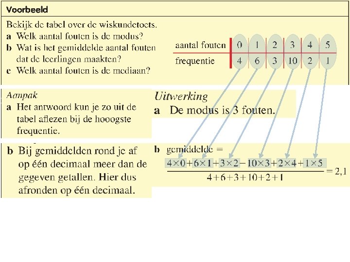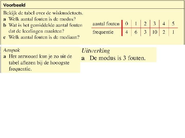 Dus… 0457168783997860 a) Welk getal is de modus? De 7 en 8 komen allebei even vaak voor (3 x), dus er is geen modus. b) Welk getal is de mediaan? Eerst de rij op volgorde zetten: 0013456677788899 Er zijn 16 getallen, dus de middelste zijn de 8 e en 9 e mediaan = (6+7) : 2 = 6, 5