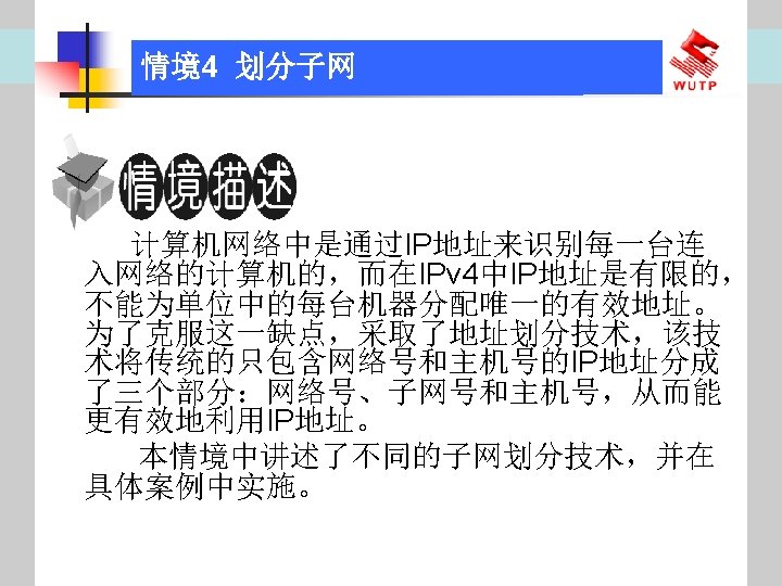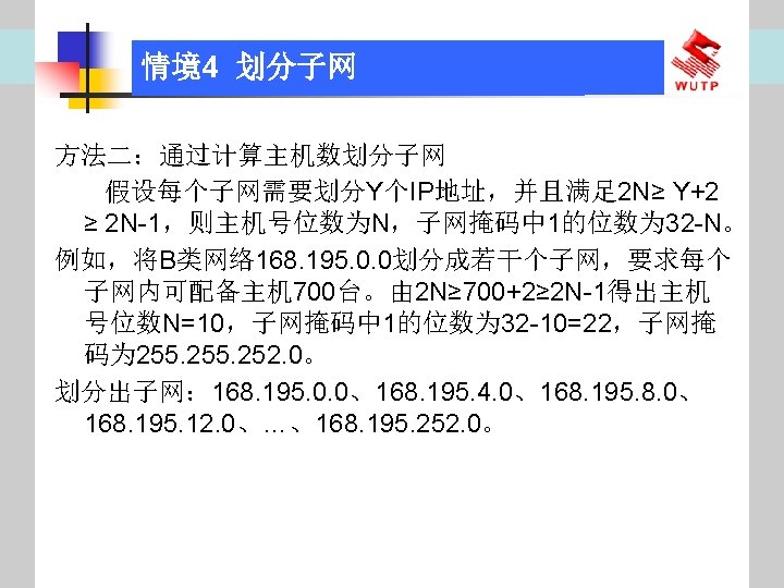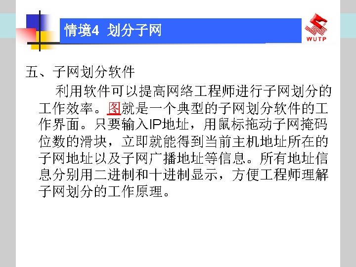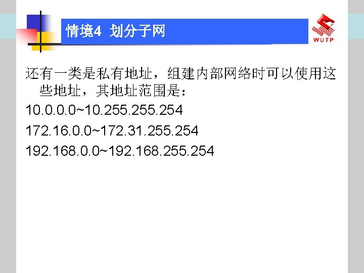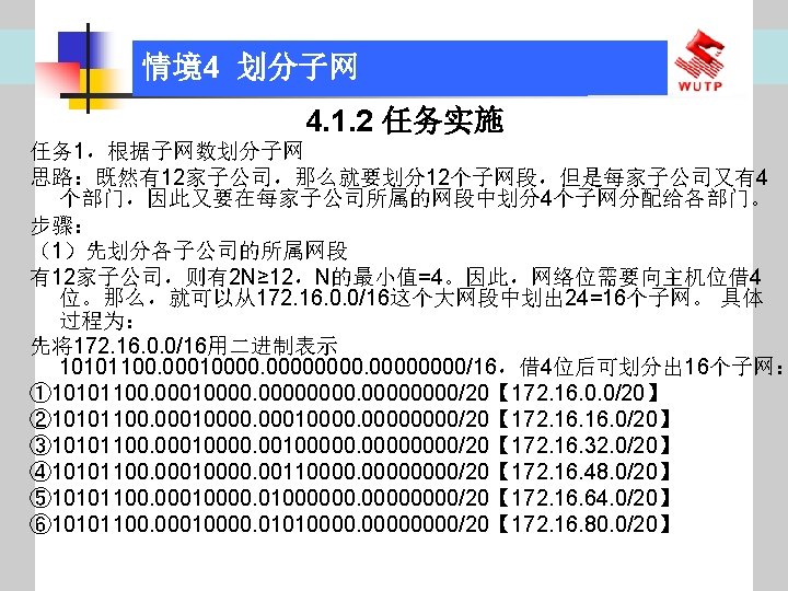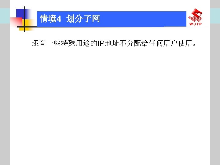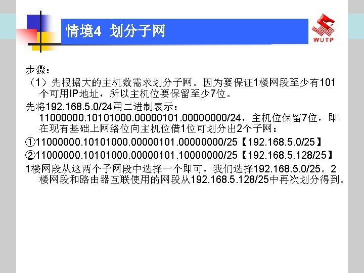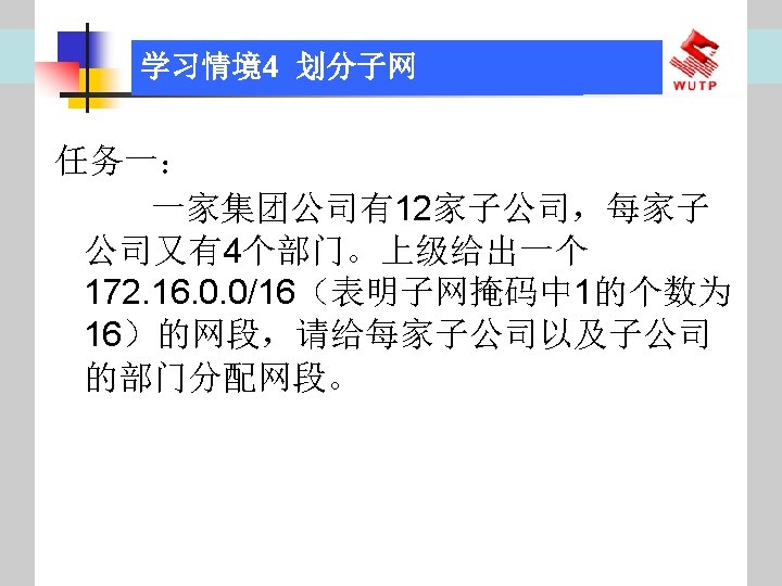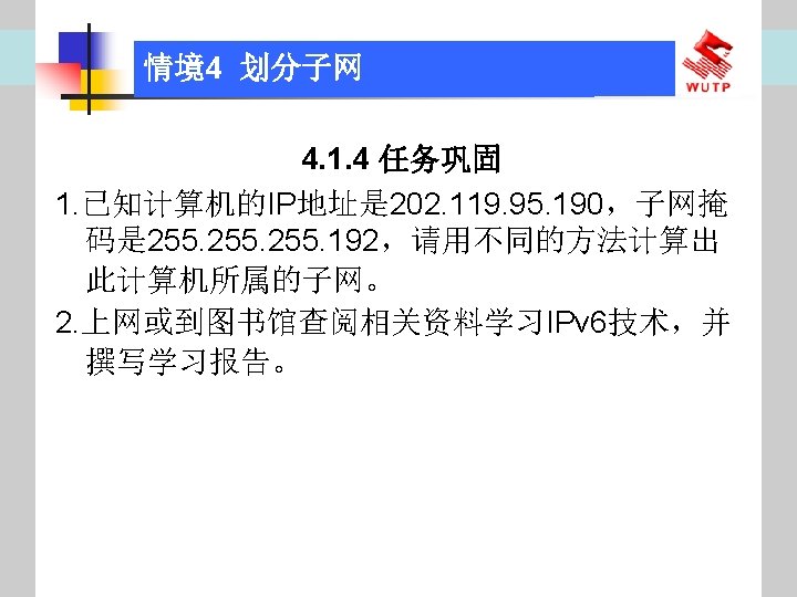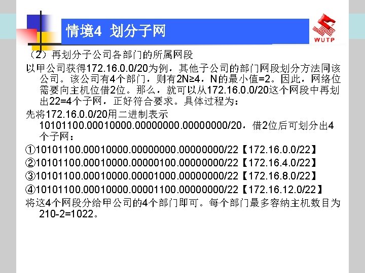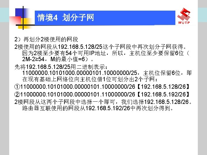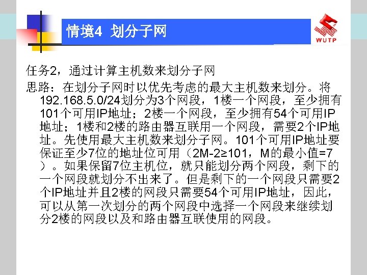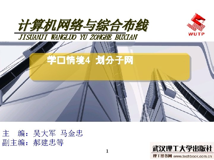 4 10101100 00010000 0110000020 172 16 96 020 Slides: 30 Download presentation 情境4 划分子网 ⑦ 10101100. 00010000. 01100000/20【 172. 16. 96. 0/20】 ⑧ 10101100. 00010000. 01110000/20【 172. 16. 112. 0/20】 ⑨ 10101100. 00010000000. 0000/20【 172. 16. 128. 0/20】 ⑩ 10101100. 00010000. 10010000/20【 172. 16. 144. 0/20】 10101100. 00010000. 10100000/20【 172. 160. 0/20】 10101100. 00010000. 10110000/20【 172. 16. 176. 0/20】 10101100. 00010000. 11000000/20【 172. 16. 192. 0/20】 10101100. 00010000. 11010000/20【 172. 16. 208. 0/20】 10101100. 00010000. 11100000/20【 172. 16. 224. 0/20】 10101100. 00010000. 11110000/20【 172. 16. 240. 0/20】 从这 16个子网中选择 12个即可,就将前12个分给下面的各子公司。每 个子公司最多容纳主机数目为 212 -2=4094。 情境4 划分子网 (3)最后划分路由器互联使用的网段从192. 168. 5. 192/26这个子网段中再次划分子网 获得。因为只需要2个可用IP地址,所以,主机位只要保留 2位即可 (2 M-2≥ 2,M的最小值=2)。 先将192. 168. 5. 192/26用二进制表示: 11000000. 10101000. 00000101. 11000000/26,主机位保留 2位,即 在现有基础上网络位向主机位借 4位可划分出 16个子网: ① 11000000. 10101000. 00000101. 11000000/30【 192. 168. 5. 192/30】 ② 11000000. 10101000. 00000101. 11000100/30【 192. 168. 5. 196/30】 ③ 11000000. 10101000. 00000101. 11001000/30【 192. 168. 5. 200/30】 …… 11000000. 10101000. 00000101. 11110100/30【 192. 168. 5. 244/30】 11000000. 10101000. 00000101. 11111000/30【 192. 168. 5. 248/30】 11000000. 10101000. 00000101. 11111100/30【 192. 168. 5. 252/30】 路由器互联网段从这 16个子网中选择一个即可,我们选择 192. 168. 5. 252/30。 计算机网络与综合布线 JISUANJI WANGLUO YU ZONGHE BUXIAN 武汉理 大学出版社发行部 http: //www. techbook. com. cn 地 址:武汉市武昌珞狮路 122号 邮 编: 430070 电 话: 027 -87394412 87383695 1
