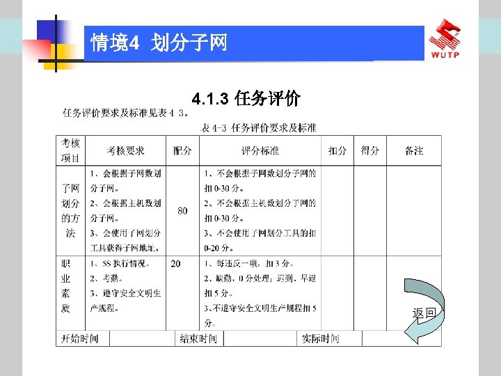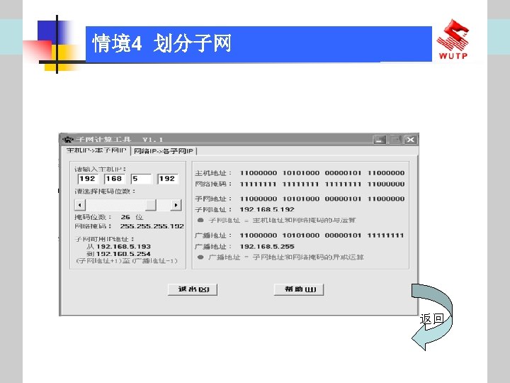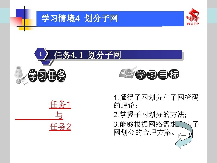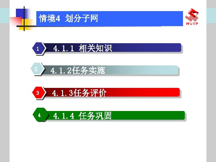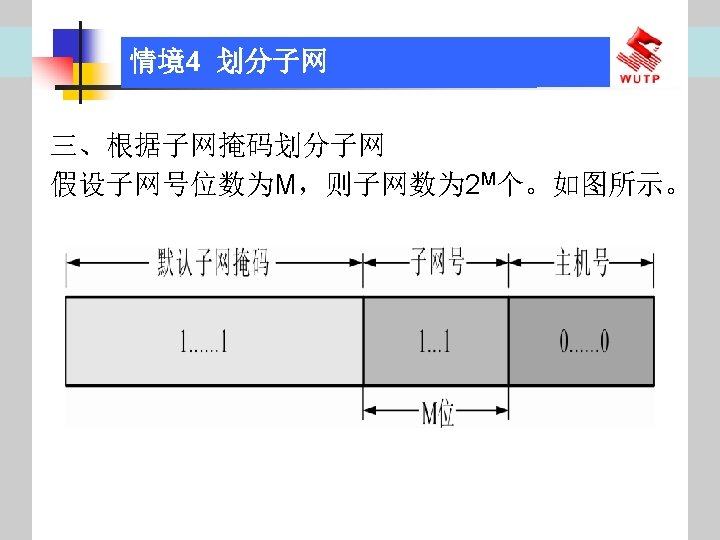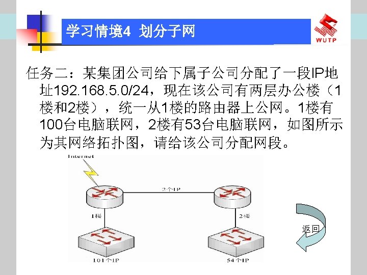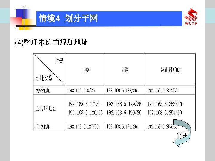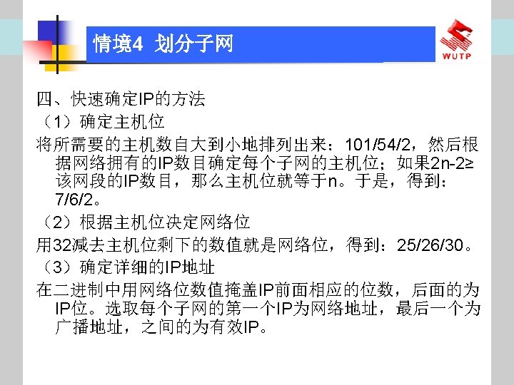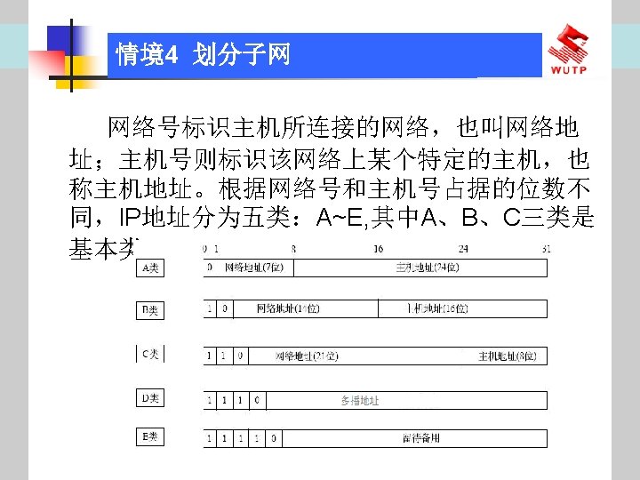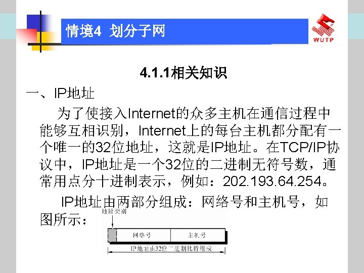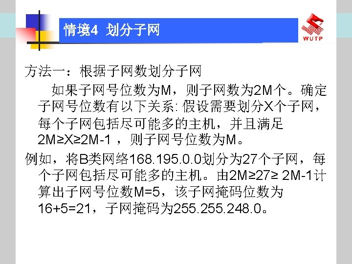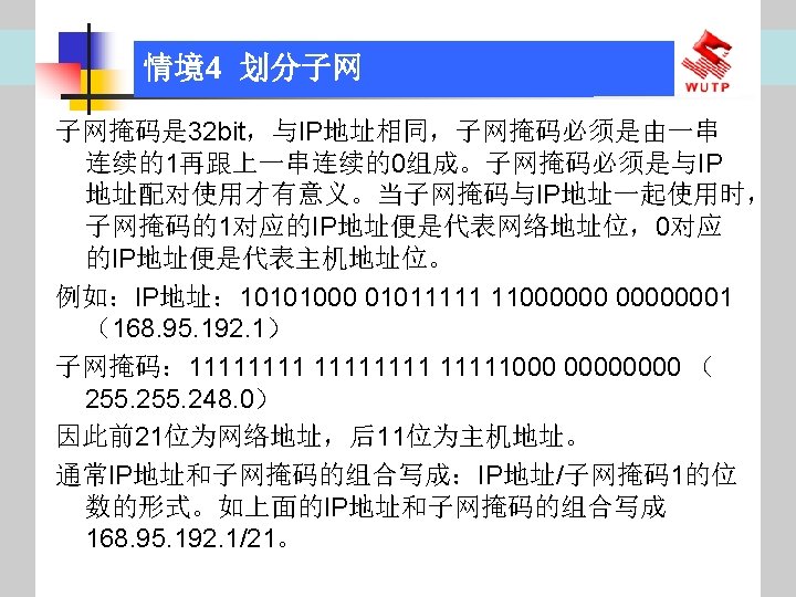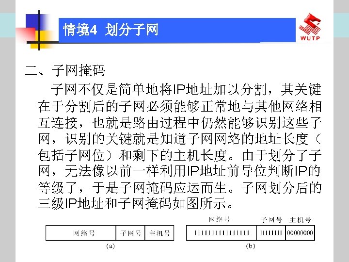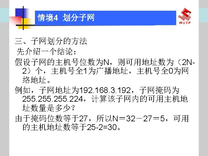 4 10101100 00010000 0110000020 172 16 96 020 Slides: 30 Download presentation 情境4 划分子网 ⑦ 10101100. 00010000. 01100000/20【 172. 16. 96. 0/20】 ⑧ 10101100. 00010000. 01110000/20【 172. 16. 112. 0/20】 ⑨ 10101100. 00010000000. 0000/20【 172. 16. 128. 0/20】 ⑩ 10101100. 00010000. 10010000/20【 172. 16. 144. 0/20】 10101100. 00010000. 10100000/20【 172. 160. 0/20】 10101100. 00010000. 10110000/20【 172. 16. 176. 0/20】 10101100. 00010000. 11000000/20【 172. 16. 192. 0/20】 10101100. 00010000. 11010000/20【 172. 16. 208. 0/20】 10101100. 00010000. 11100000/20【 172. 16. 224. 0/20】 10101100. 00010000. 11110000/20【 172. 16. 240. 0/20】 从这 16个子网中选择 12个即可,就将前12个分给下面的各子公司。每 个子公司最多容纳主机数目为 212 -2=4094。 情境4 划分子网 (3)最后划分路由器互联使用的网段从192. 168. 5. 192/26这个子网段中再次划分子网 获得。因为只需要2个可用IP地址,所以,主机位只要保留 2位即可 (2 M-2≥ 2,M的最小值=2)。 先将192. 168. 5. 192/26用二进制表示: 11000000. 10101000. 00000101. 11000000/26,主机位保留 2位,即 在现有基础上网络位向主机位借 4位可划分出 16个子网: ① 11000000. 10101000. 00000101. 11000000/30【 192. 168. 5. 192/30】 ② 11000000. 10101000. 00000101. 11000100/30【 192. 168. 5. 196/30】 ③ 11000000. 10101000. 00000101. 11001000/30【 192. 168. 5. 200/30】 …… 11000000. 10101000. 00000101. 11110100/30【 192. 168. 5. 244/30】 11000000. 10101000. 00000101. 11111000/30【 192. 168. 5. 248/30】 11000000. 10101000. 00000101. 11111100/30【 192. 168. 5. 252/30】 路由器互联网段从这 16个子网中选择一个即可,我们选择 192. 168. 5. 252/30。 计算机网络与综合布线 JISUANJI WANGLUO YU ZONGHE BUXIAN 武汉理 大学出版社发行部 http: //www. techbook. com. cn 地 址:武汉市武昌珞狮路 122号 邮 编: 430070 电 话: 027 -87394412 87383695 1