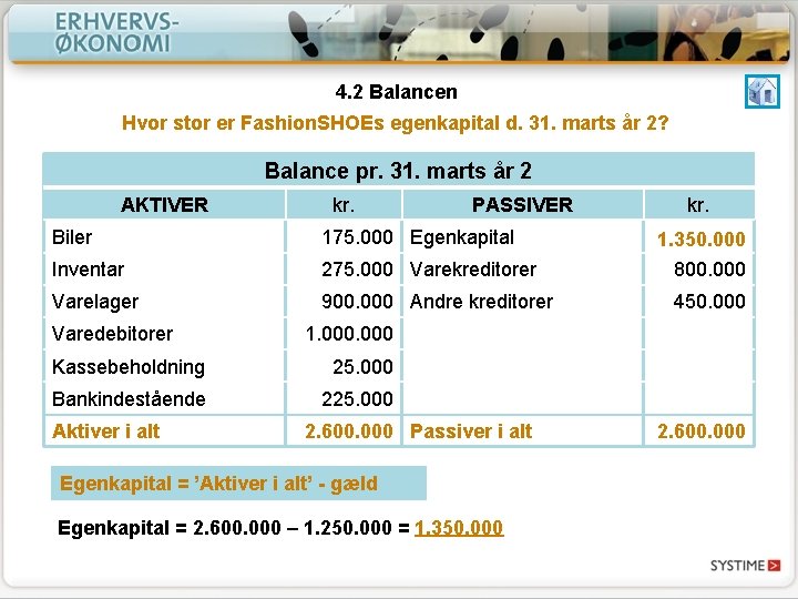 4. 2 Balancen Hvor stor er Fashion. SHOEs egenkapital d. 31. marts år 2? Balance pr. 31. marts år 2 AKTIVER kr. PASSIVER Biler 175. 000 Egenkapital Inventar 275. 000 Varekreditorer Varelager 900. 000 Andre kreditorer Varedebitorer 1. 350. 000 800. 000 450. 000 1. 000 Kassebeholdning 25. 000 Bankindestående 225. 000 Aktiver i alt kr. 2. 600. 000 Passiver i alt Egenkapital = ’Aktiver i alt’ - gæld Egenkapital = 2. 600. 000 – 1. 250. 000 = 1. 350. 000 2. 600. 000