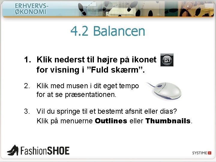 4. 2 Balancen 1. Klik nederst til højre på ikonet for visning i ”Fuld skærm”. 2. Klik med musen i dit eget tempo for at se præsentationen. 3. Vil du springe til et bestemt afsnit eller dias? Klik på menuerne Outlines eller Thumbnails.