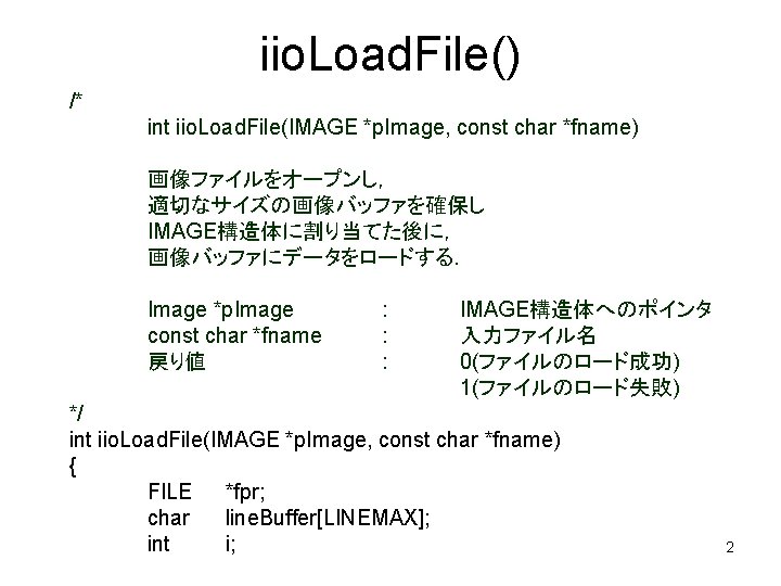 iio. Free. Image. Buffer()の作り方 void iio. Free. Image. Buffer(IMAGE *p. Image) { int i; ←画像の行数だけ繰り返すループ変数 方針:Bを開放してからAを開放する p. Image->p. Buffer A B 8