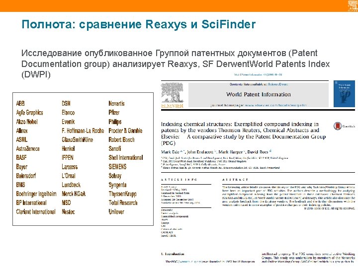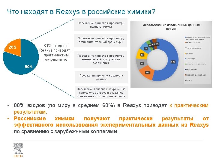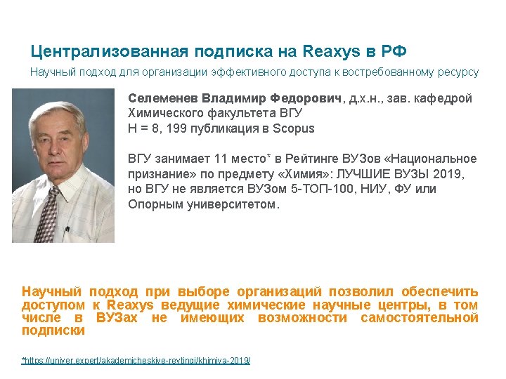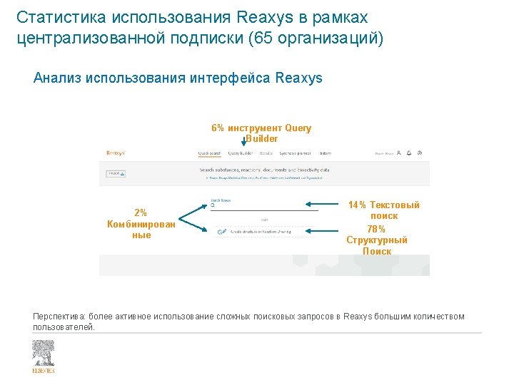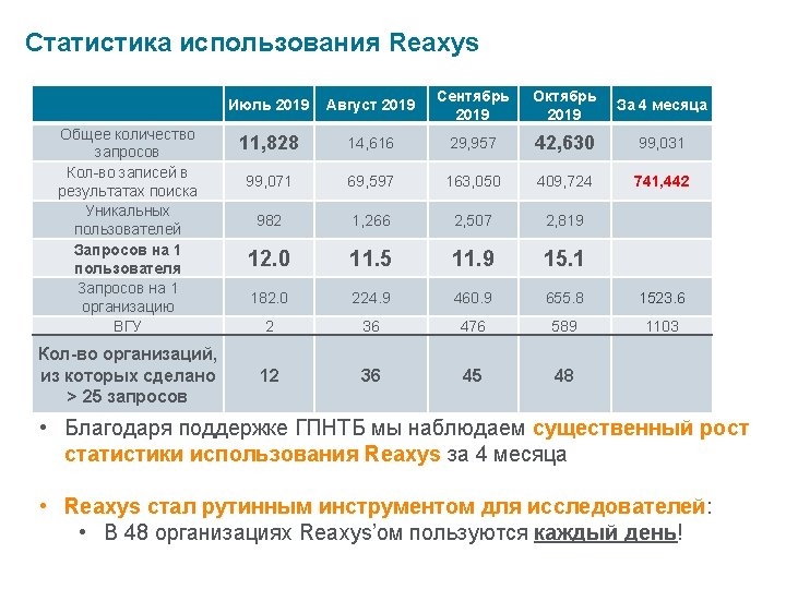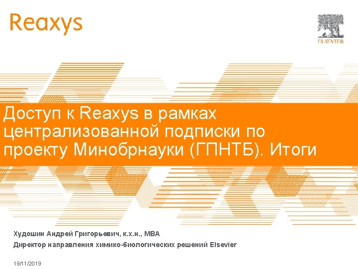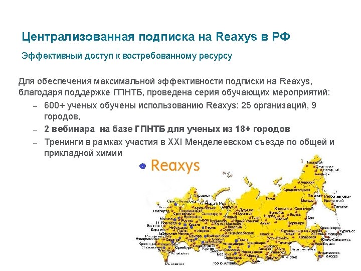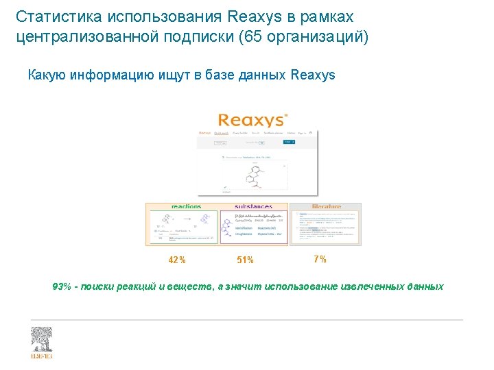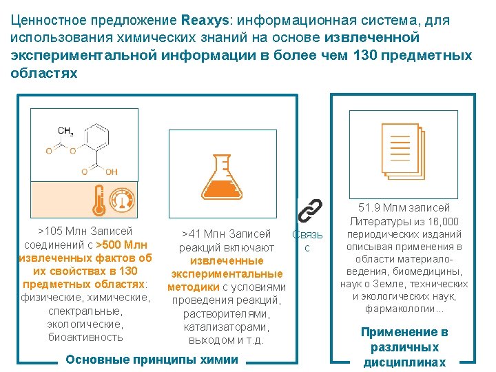 REAXYS 2019 ОБЗОР A Bibliographic Database >60 million records (from ~16, 000 journal titles plus records from key patent organizations) A Bioactivity Database A Substance Database >118 million substances (total integrated content) ~ 87 million substances (unique) A Target Database Reaxys & RMC 2019 >37 million experimental bioactivity data points A Chemical Reaction Database >49 million single- and multistep reactions 26 740 targets incl. species information A Property Database > 500 million experimental properties in > 400 fields in > 130 subject areas
