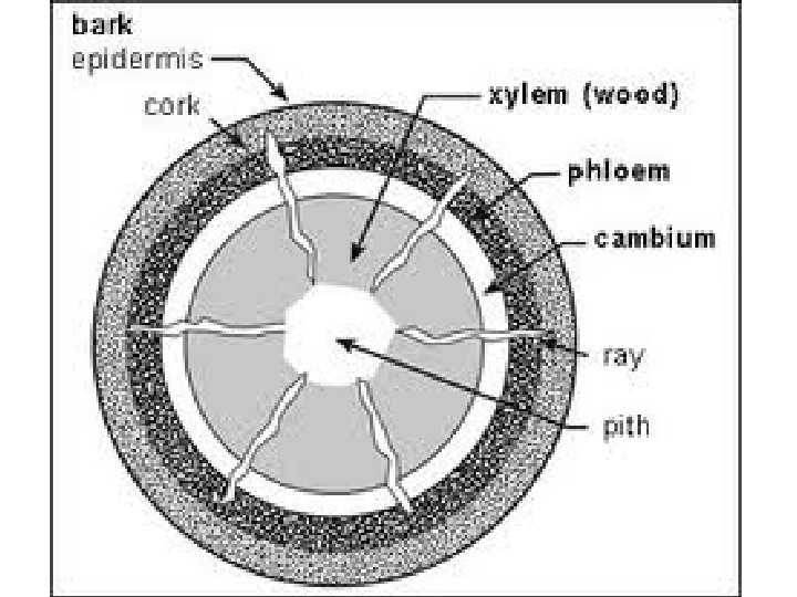 OZNACZENIA 1. RDZEŃ, MIĘKISZ , PARENCHYMA 2. PROTOKSYLEM 3. KSYLEM 4. FLOEM 5. SKLERENCHYMA 6. KORA 7. SKÓRKA