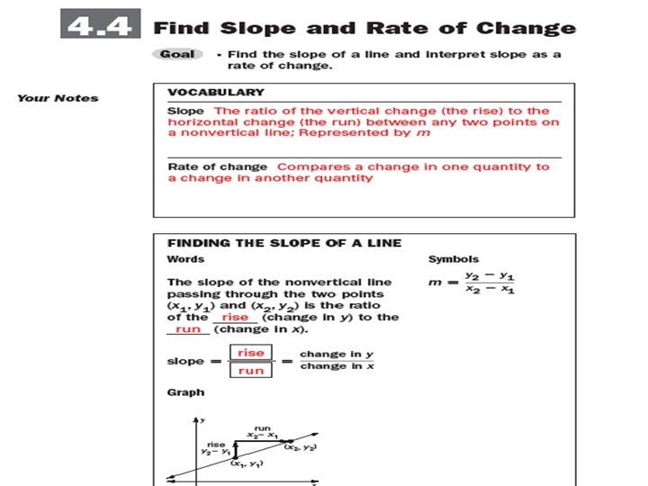 4. 4 Find Slope and Rate of Change • Students will find the slope of a line and interpret slope as a rate of change. • Students will do assigned homework. • Students will study vocabulary words.