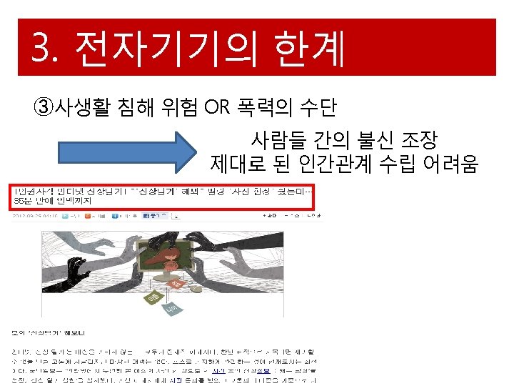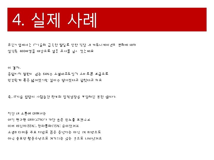 4 5 http news naver commainread nhn modeLPOD Slides: 18 Download presentation 4. 실제 사례 "하루 5시간 이상 사용" 스마트폰 중독 심각 http: //news. naver. com/main/read. nhn? mode=LPOD& mid=tvh&oid=055&aid=0000237934 6. 참고 문헌 “위키백과 - 인간관계” <http: //ko. wikipedia. org/wiki/%EC%9 D%B 8%EA%B 0%84_%EA%B 4%80%EA%B 3%84> “아란이의 IT월드”<http: //ahranta 1. blog. me/40135563001> 김교헌, “청소년들의 컴퓨터 사용 실태와 컴퓨터 중독” 學生生活硏究(Journal of student guidance), p 41 -62, 2001. Katz, “Personal Mobility in the ICEBERG Integrated Communication Network”, 1999 이정화, “초등학생의 휴대전화 사용실태 연구”, 2010 “카톡 왕따” <http: //www. mt. co. kr/view/mtview. php? type=1&no=2012100216151899296&outlink=1 > “[인권사각 인터넷 신상털기] " '신상털기' 해봐" 딸랑 '사진 한장' 줬는데. . . 35분 만에 인맥까지. ” http: //news. kukinews. com/article/view. asp? page=1&g. Code=kmi&arcid=0006485153&cp=nv “[cover story] 스마트혁명의 그림자. . . 인간의 정체성이 흔들리다. ” http: //www. hankyung. com/news/app/newsview. php? aid=2012050434 251