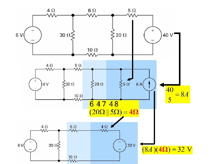Now the circuit become We now use the source transformation to replace the 250 V with the 25 W resistor with a current source and parallel resistor We now combine the parallel resistors