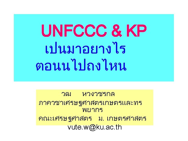 Year UNFCCC เกอบ 20 ป เปนมาอยางไร Main event 1979 The first World Climate Conference (WCC) takes place. 1988 The Intergovernmental Panel on Climate Change is set up 1990 IPCC’s first assessment report released. United Nations General Assembly negotiations on a framework convention begin 1991 First meeting of the Intergovernmental Negotiating Committee (INC) takes place The INC adopts UNFCCC text. At the Earth Summit in Rio, the UNFCCC is opened for signature 1992 1994 UNFCCC enters into force