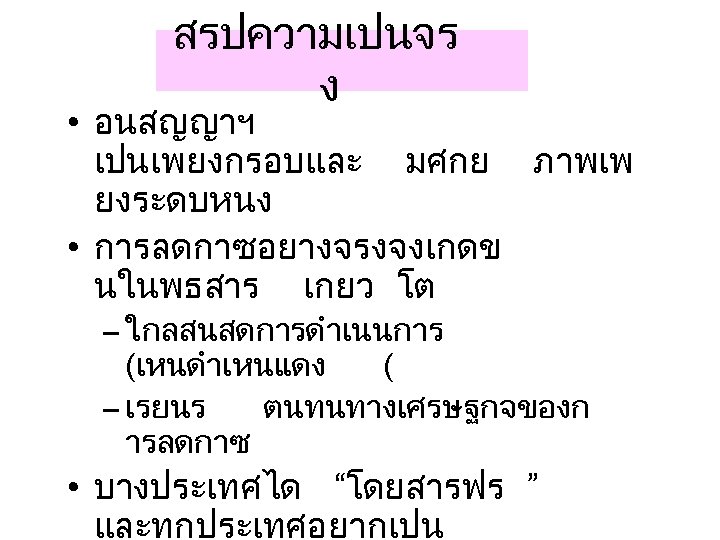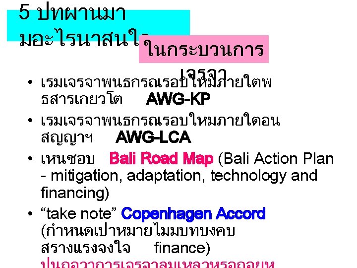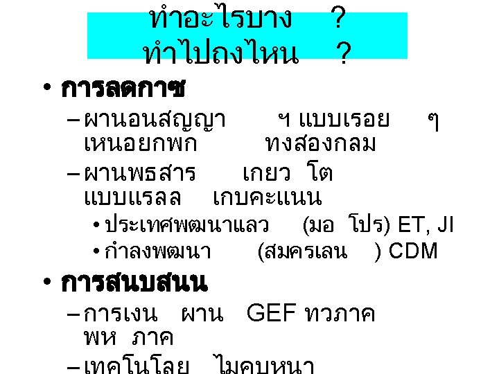 ประเดนใหญในการเจรจา • • • Inventory Mitigation Vulnerability and Adaptation Financial supports Development and transfer of เรองใหญใ technology นอนาคต • National Communication Transboundary emissions