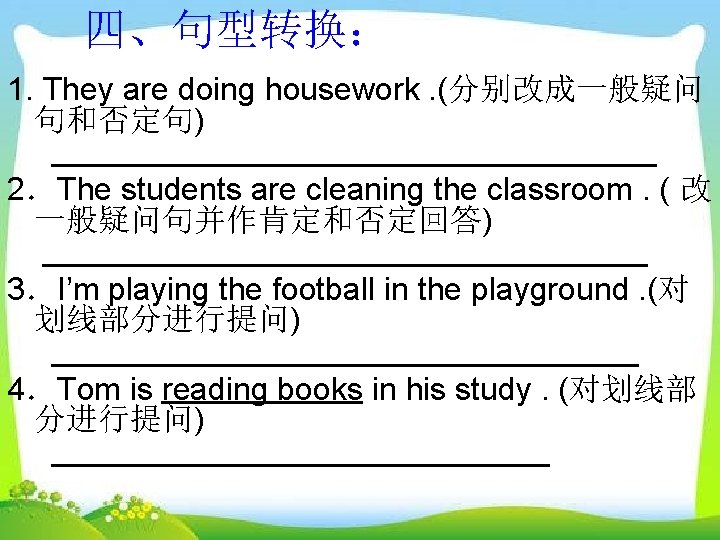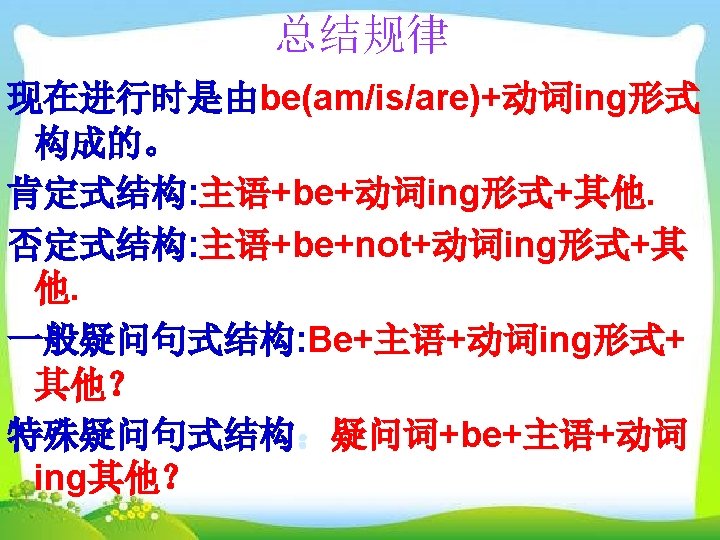 4. 一般疑问构成及简答: Am/Is/Are+主语+现在分词+ 其它? Yes, I am(he/she is. ) /No, they aren’t. 特殊疑问举例: What are you doing now? Who is flying a kite there?