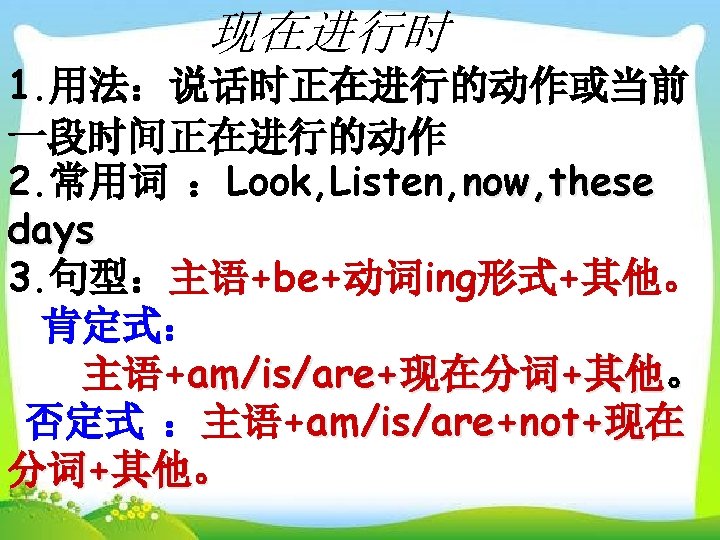 标志性词语 1. 现在进行时. 通常用“now”. I am doing my homework now. 2. 现在进行时. 通常用“look”. Look! My mother is running!!! 3. 现在进行时. 通常用“listen”. Listen! They are reading. 4. 现在进行时. 通常用“at the (this) moment” At the (this) moment, he is only weeping.