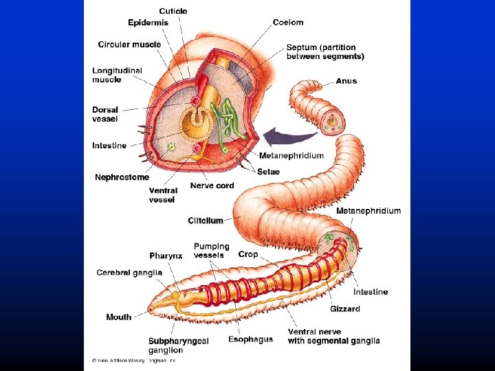 D. Segmented Worms (phylum Annelida) • 20, 000 spp. known as Annelids • First example of segmentation. • Gut through all segments and lies in cavity known as coelom – Coelom fluid filled and divided by partitions