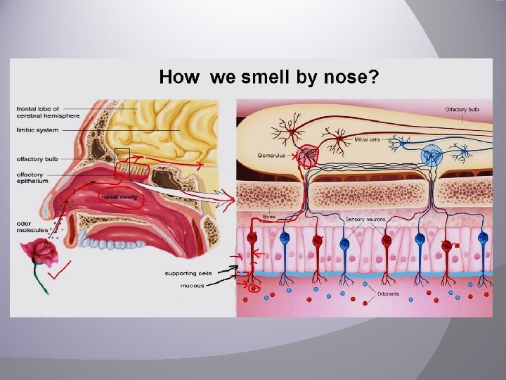 OLFACTION (SMELL SENSATION) Although the healthy person can discriminate more than 10, 000 different odors, yet smell sensation is not highly developed in human as in many animals. Significance of Smell Sensation 1 - It is closely related to taste sensation so in severe rhinitis (inflammation of the nose) many foods loose their specific taste. 2 - The receptors of olfaction are chemoreceptors and they are true neurons and it is said that the olfactory mucosa is the site in which nervous system is the nearest to the external environment. 3 - Olfactory sensations produce many effects in other organs e. g. they stimulate sexual derive. Olfactory sense is more highly developed in females than males and it is most sensitive at time of ovulation. 4 - Olfactory sensations either stimulate or inhibit gastro- intestinal secretion and motility. 5 -Smell sensations produce psychogenic effects e. g. sensations of pleasure in response to pleasant odorous as perfumes. 6 -Smell sensation has protective function because they inform us about dangerous odors like gases or fire. Olfactory Mucosa It lies in the roof of the nasal cavity near the septum (on the superior conchea) covering an area of about 6 cm 2 and is characterized by being yellowish pigmented area and by containing tubular Bowman's glands beside absence of the rhythmic movement of the cilia which characterized normal respiratory mucous membranes. The olfactory mucosa contains three types of cells: 1 - Receptor cells which are true bipolar neurons from 10: 20 millions in number having short thick dendrites with an expanded end called the olfactory rod from which cilia project to the mucous surface of the nasal cavity. The axons of the olfactory neurons penetrate the cribriform plate of the ethmoid bone to enter the olfactory bulb starting then olfactory pathway. These receptor cells are derived originally from the C. N. S itself. . 2 - Supporting cells or sustentacular cells with the Bowman's gland secrete a mucous layer. 3 - Stem cells or basal cells from which new receptor cells regenerate by mitosis. - Any substance to be able to stimulate olfactory receptors must be volatile to come in contact with olfactory epithelium and also it must be both water and lipid soluble to be dissolved in the thin mucous layer overlying these olfactory receptors and to cross the cell membrane.