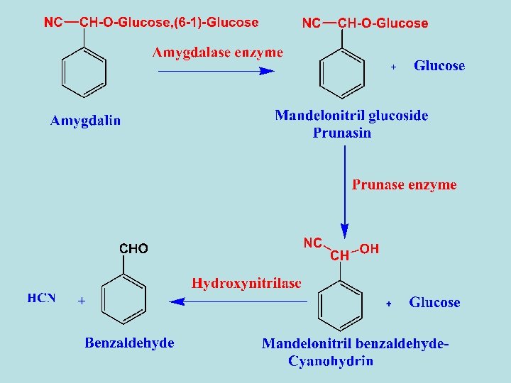 1 - Enzymatic hydrolysis - Almonds contain a mixture of enzymes called emulsin which consists of amygdalin hydrolase, prunasin hydrolase and Hydroxynitrilase. When bitter almond are crushed in the presence of water amygdalin hydrolysis in catalyst of these enzymes to yield glucose, hydrogen cyanide and benzaldehyde. 2 - Acidic Hydrolysis - By acid hydrolysis amygdalin yields benzaldehyde, 2 molcules of β-DGlucose and 1 mole of HCN.