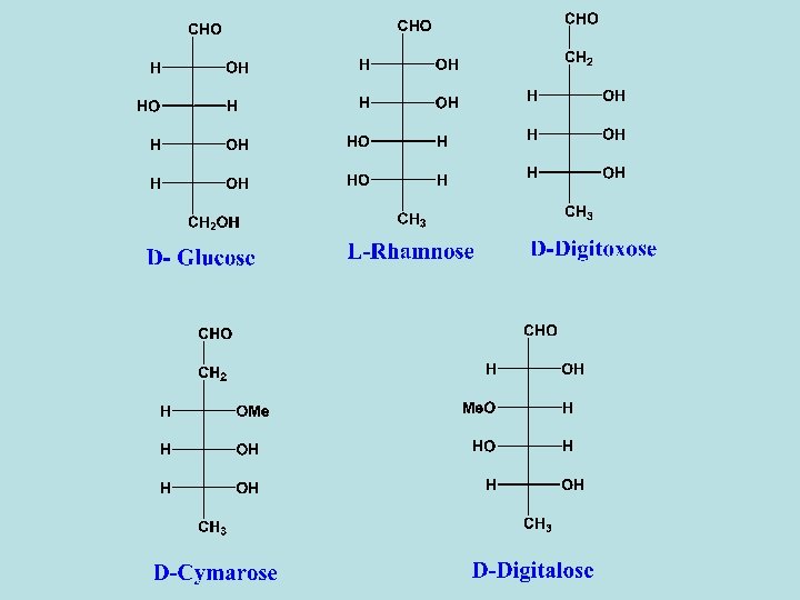 Sugars of cardiac glycosides - The activity of the cardiac glycosides is considerably modified by the sugar moiety. - Combination of sugar with the aglycone increases both the potency and toxicity of the active principle. - The sugar may affect certain physical properties such as water solubility and diffusion througn semipermeable membranes and consequently the rate of absorption and transportion of the compound to the site of action. - Some of the sugar units found in cardiac glycosides are normal as glucose or methyl pentose as rhamnose and others are deoxy sugar as digitoxose, cymarose and sarmentose which are 2 -deoxy sugars. In some sugars the C-3 hydroxyl group is methylated as cymarose, digitalose and sarmentose