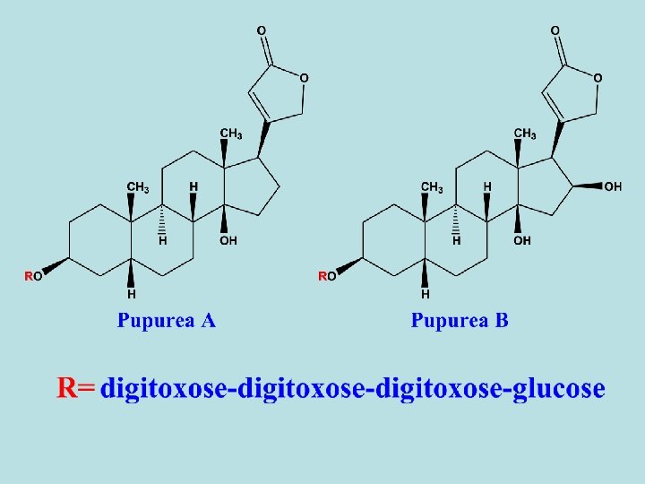 -Digitalis purpurea contains differnt types of primary and secondary cardiac glycosides. - 1 ry glycosides as purpurea A and B. - 2 ry glycosides are resulted from partial hydrolysis (during drying) as digitoxin and gitoxin. - Purpurea A and B are frequently referred as deacetyl lanatoside A and B. - Besides the cardiac glycosides, digitalis leaf contains also sponins. - Digitoxin is the main 2 ry glycoside of D. Purpurea and its effect starts very slowly and reaches its maximum 8 -12 hours after being taken orally. The excretion of the compound is also slow, so that risk of overdosage through cumulation is high. So, the dosage must be determined individually to prevent cumulation.