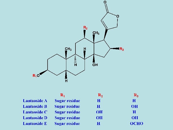 1 - Digitalis glycosides - The leaves of Digitalis purpurea contain about 30 different glycosides, most of them are cardiac glycosides. - On the other hand, around 70 different glycosides have been isolated from D. Lanata leaf. Most of them are cardiac glycosides. - D. Lanata is three times potent than D. Purpurea. - The enzymes present in the leaves of the Digitalis degrade the sugar moieties of the glycosides, so that the dried leaves (crude drug) may contain both sugar-rich primary glycosides and secondary glycosides. - The cardiac glycosides of Digitalis can be divided into three groups according to the structure of the aglycone.