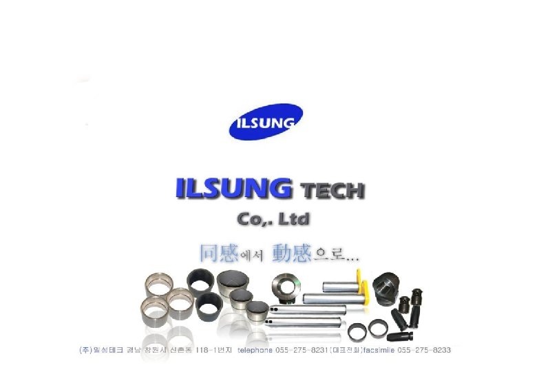 4. 주요 생산제품 - 건설장비 부품 - 나선형 GROOVE BUSH - 일반 X-GROOVE BUSH - PIN ASS’Y ROD EYE TUBE END BASE CUSHION RING - STEEL류 - ER-Cu. Al A 2 상당류 - CHECK VALVE - INNER RING - LOCK NUT ㈜일성테크