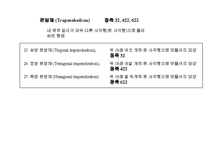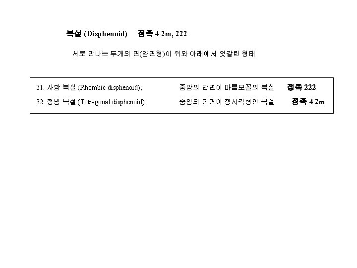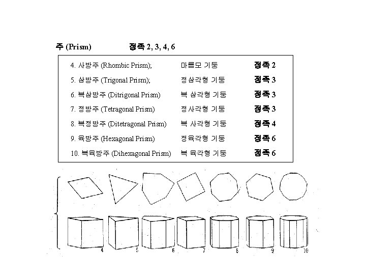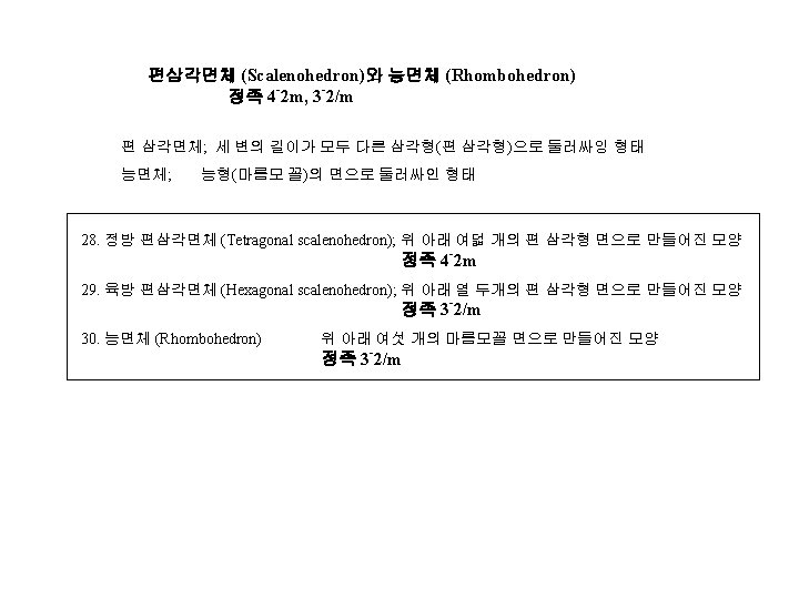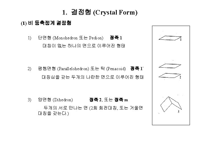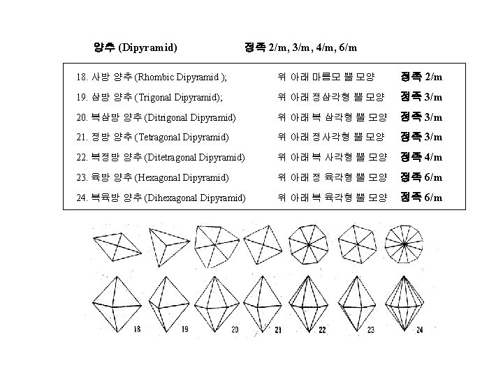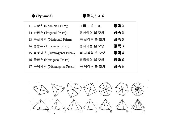 4 IV 1 Crystal Form 2 Crystal Projection Slides: 12 Download presentation 제 4장 결정학 IV 1. 결정형 (Crystal Form) 2. 결정의 투영 (Crystal Projection) 정팔면체 계열 정족 4/m 3 -2/m, 432 36. 정팔면체 (Octahedron); 정족 4/m 3 -2/m - 37. 삼팔면체 (Trigon-trioctahedron); 정족 4/m 3 2/m 38. 등축 편방체 (Tetragon-trioctahedron) 정족 4/m 3 -2/m 39. 편오각 이십사면체 (Pentagon-trioctahedron) 정족 432 40. 육팔면체 (Hexaoctahedron) 정족 4/m 3 -2/m 정사면체 계열 정족 4 -3 m, 23 41. 정사면체 (Tetrahedron); 정족 4 -3 m 42. 편능형 십이면체 (Tetragon-tritetrahedron) 정족 4 -3 m 43. 삼사체 (Trigon-tritetrahedron) 정족 4 -3 m 44. 편오각 십이면체 (Pentagon-tritetrahedron) 정족 23 45. 육사면체 (Hexatetrahedron) 정족 4 -3 m