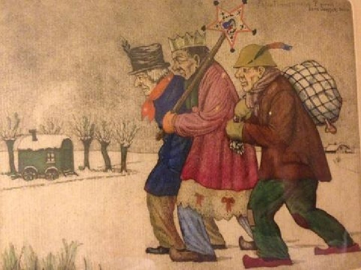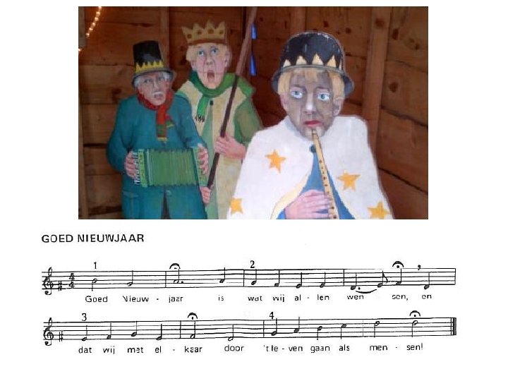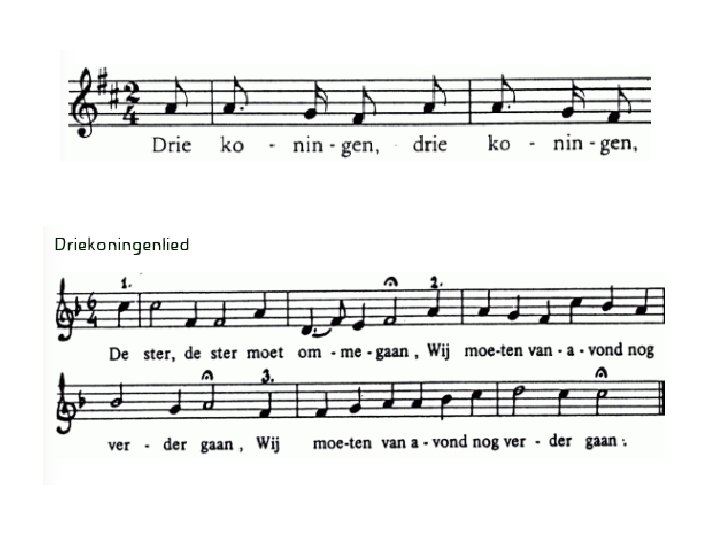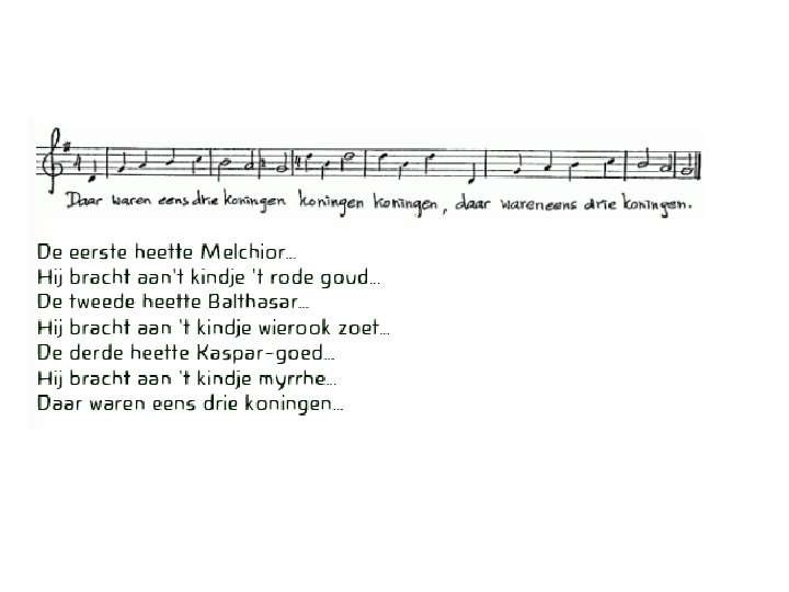 Driekoningen, driekoningen, geef mij nen nieuwen hoed. Mijnen ouden is versleten, mijn moeder mag het niet weten. Mijn vader heeft het geld op de rooster geteld.