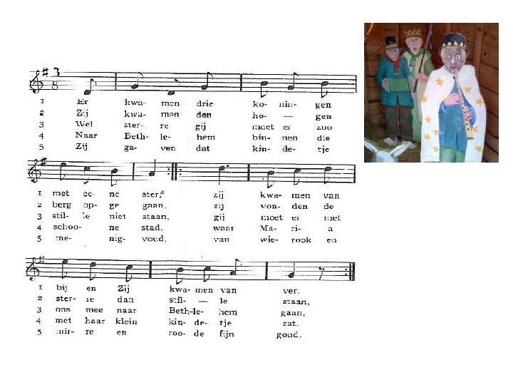 Uit Susa Nina … Drie koningen kwamen naar 't Kindje van ver Zij volgden het licht van de stralende ster Zij hebben de Godmens, de Koning aanschouwd En offerden wierook en mirre en goud